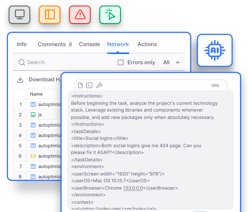Our AI instantly analyzes user feedback, captures task context, and gathers technical data to create a detailed prompt. This gives your AI everything it needs to solve the task on the first try.