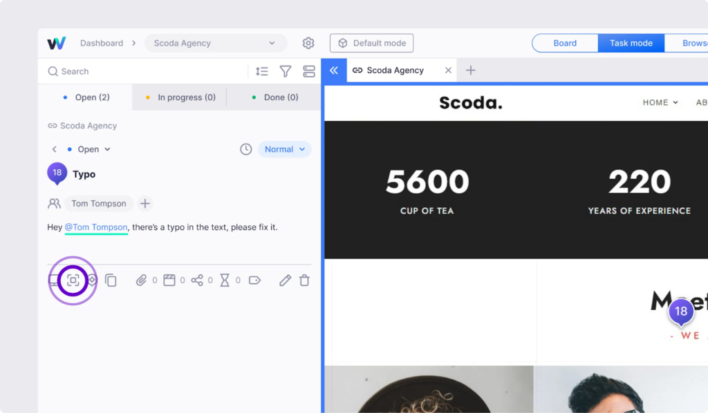 Every time a task is created, Webvizio automatically captures a high-resolution screenshot of the specific area, showing the exact position of the task marker relative to the surrounding site elements.